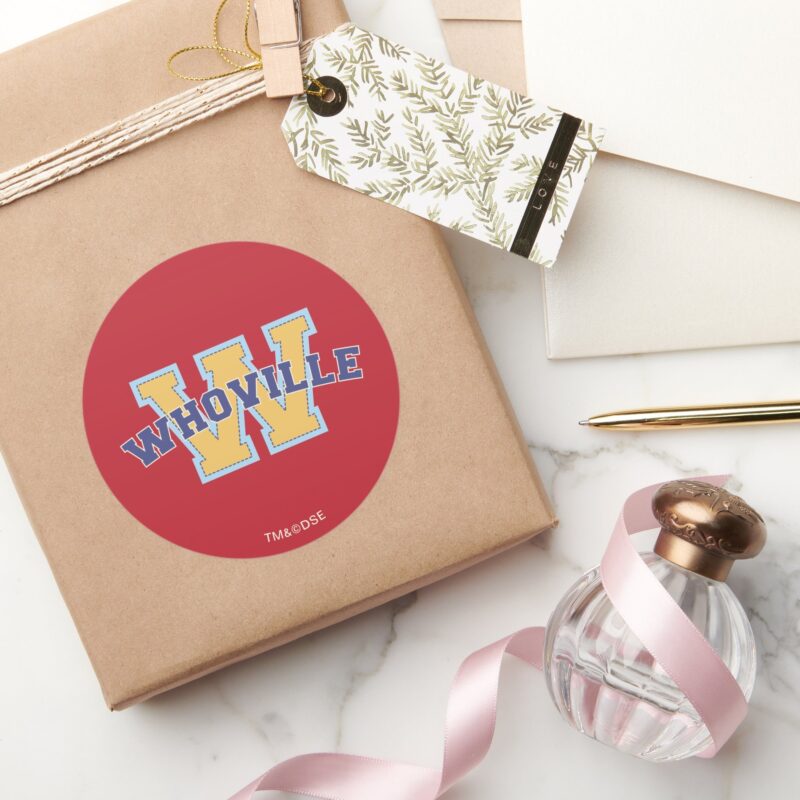 Dr. Seuss Who Ville Athletic Logo Classic Round Sticker vinyl sticker, waterproof durable collectible sticker for laptop, phone, bottle, bike, notebook, helmet, and accessories.