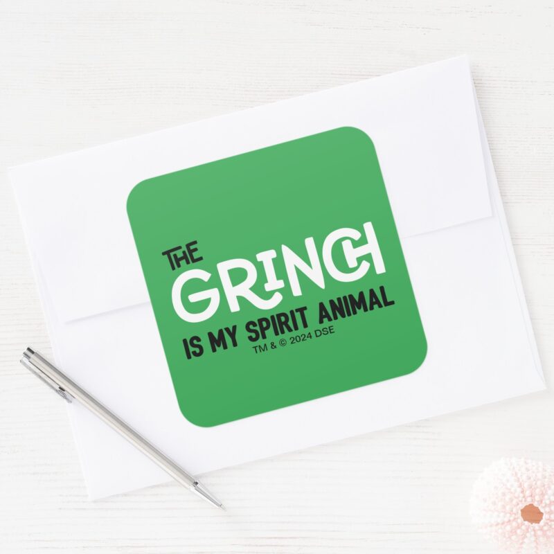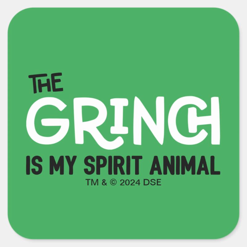 Grinch Is My Spirit Animal Quote Square Sticker vinyl sticker, waterproof durable collectible sticker for laptop, phone, bottle, bike, notebook, helmet, and accessories.