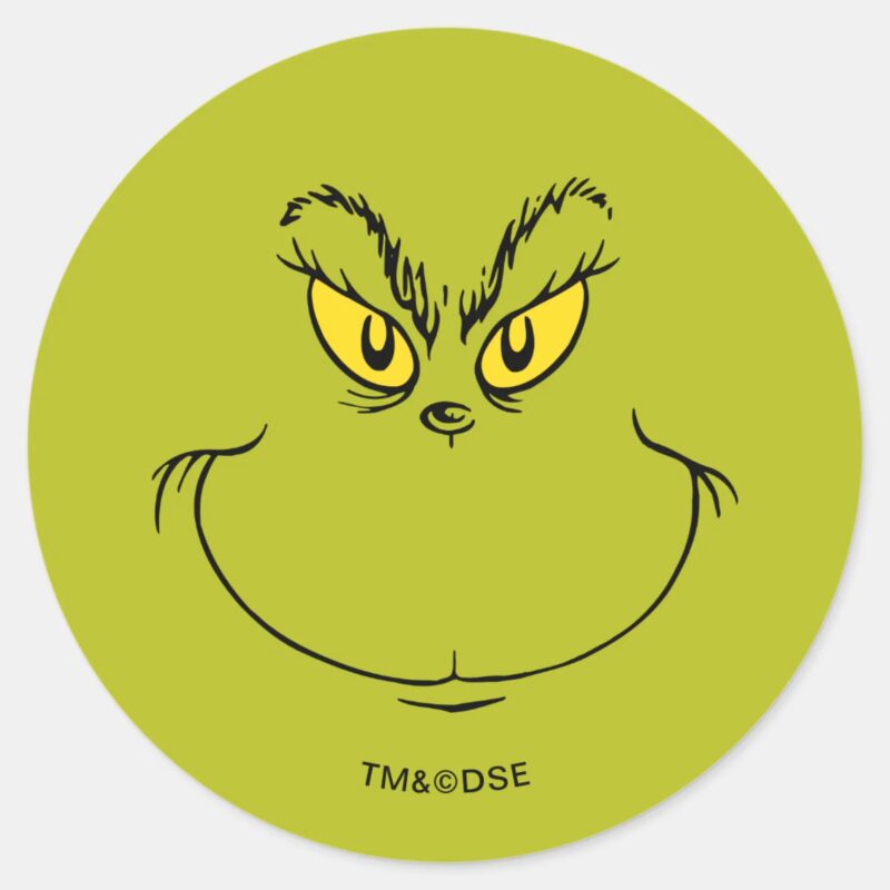 How Grinch Stole Christmas Face Classic Round Sticker vinyl sticker, waterproof durable collectible sticker for laptop, phone, bottle, bike, notebook, helmet, and accessories.