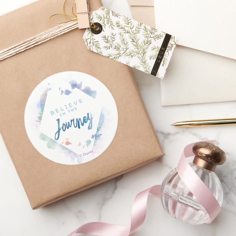 Frozen 2 Believe In The Journey Classic Round Sticker vinyl sticker, waterproof durable collectible sticker for laptop, phone, bottle, bike, notebook, helmet, and accessories.