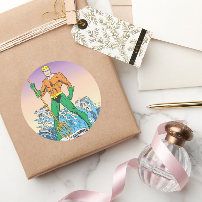 Aquaman Stands With Spear Classic Round Sticker vinyl sticker, waterproof durable collectible sticker for laptop, phone, bottle, bike, notebook, helmet, and accessories.