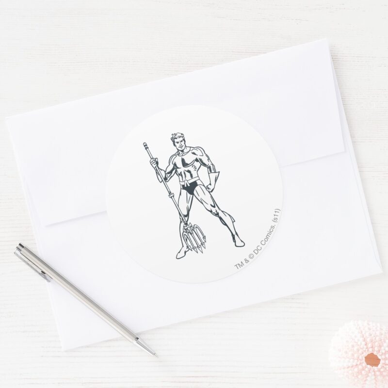 Aquaman With Pitchfork BW Classic Round Sticker vinyl sticker, waterproof durable collectible sticker for laptop, phone, bottle, bike, notebook, helmet, and accessories.