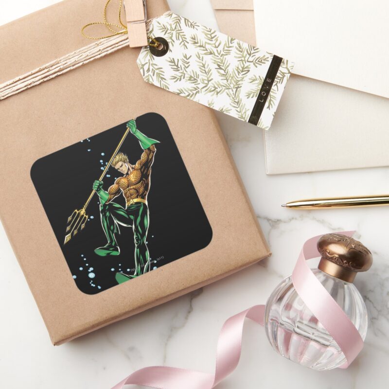 Aquaman With Spear Square Sticker vinyl sticker, waterproof durable collectible sticker for laptop, phone, bottle, bike, notebook, helmet, and accessories.