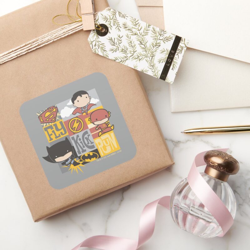 Chibi Justice League Fly Kick Run Square Sticker vinyl sticker, waterproof durable collectible sticker for laptop, phone, bottle, bike, notebook, helmet, and accessories.