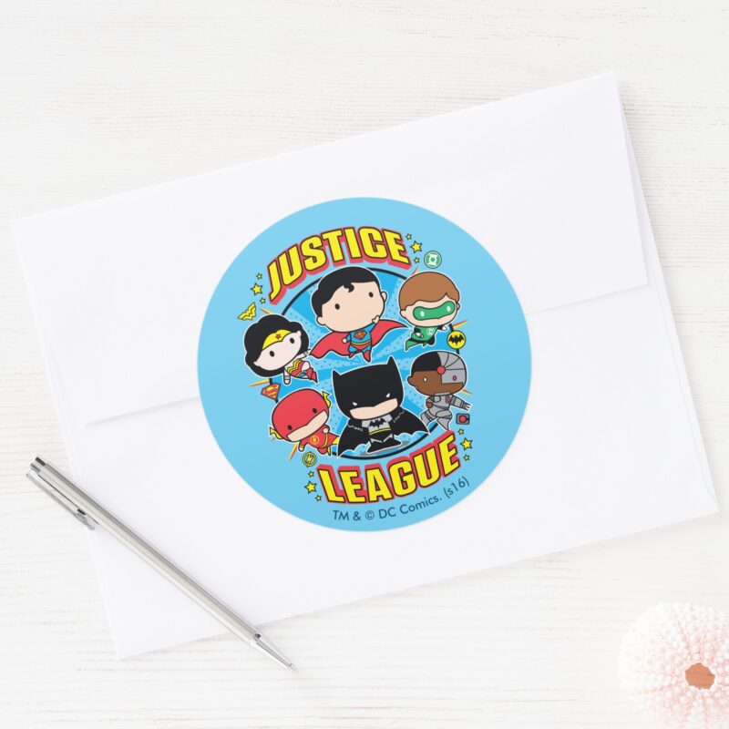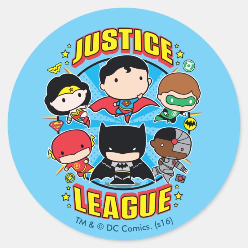 Chibi Justice League Group Classic Round Sticker vinyl sticker, waterproof durable collectible sticker for laptop, phone, bottle, bike, notebook, helmet, and accessories.
