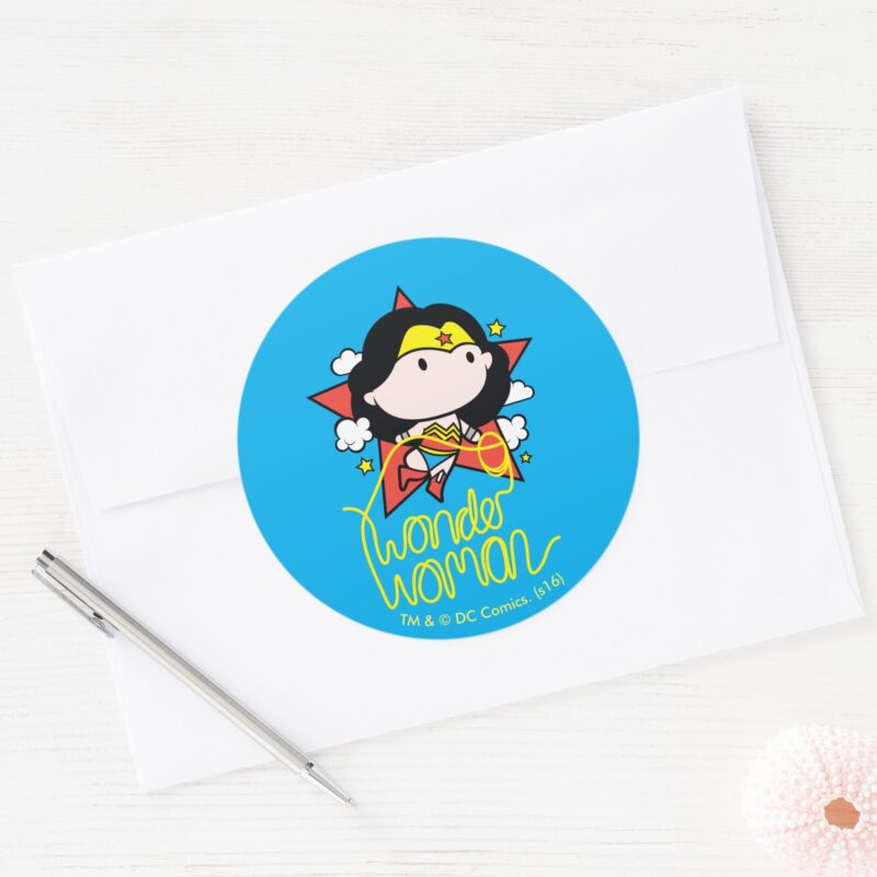 Chibi Wonder Woman Flying With Lasso Classic Round Sticker vinyl sticker, waterproof durable collectible sticker for laptop, phone, bottle, bike, notebook, helmet, and accessories.