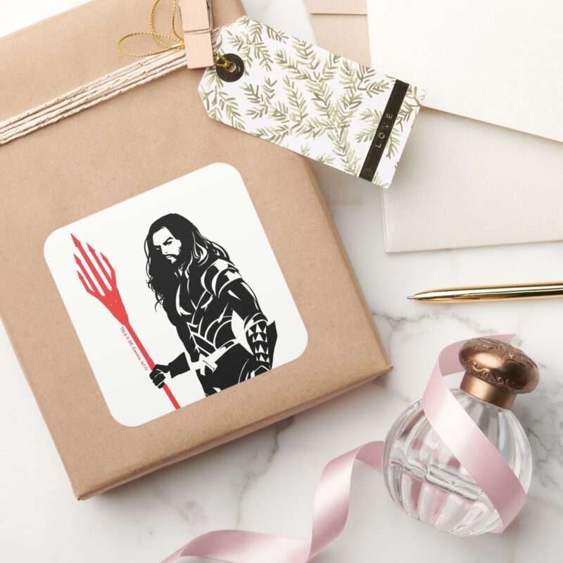 Justice League Aquaman Pose Noir Pop Art Square Sticker vinyl sticker, waterproof durable collectible sticker for laptop, phone, bottle, bike, notebook, helmet, and accessories.