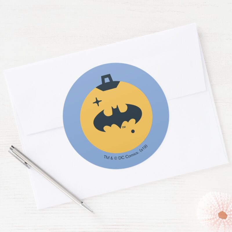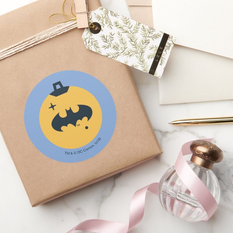 Justice League Batman Holiday Bauble Classic Round Sticker vinyl sticker, waterproof durable collectible sticker for laptop, phone, bottle, bike, notebook, helmet, and accessories.