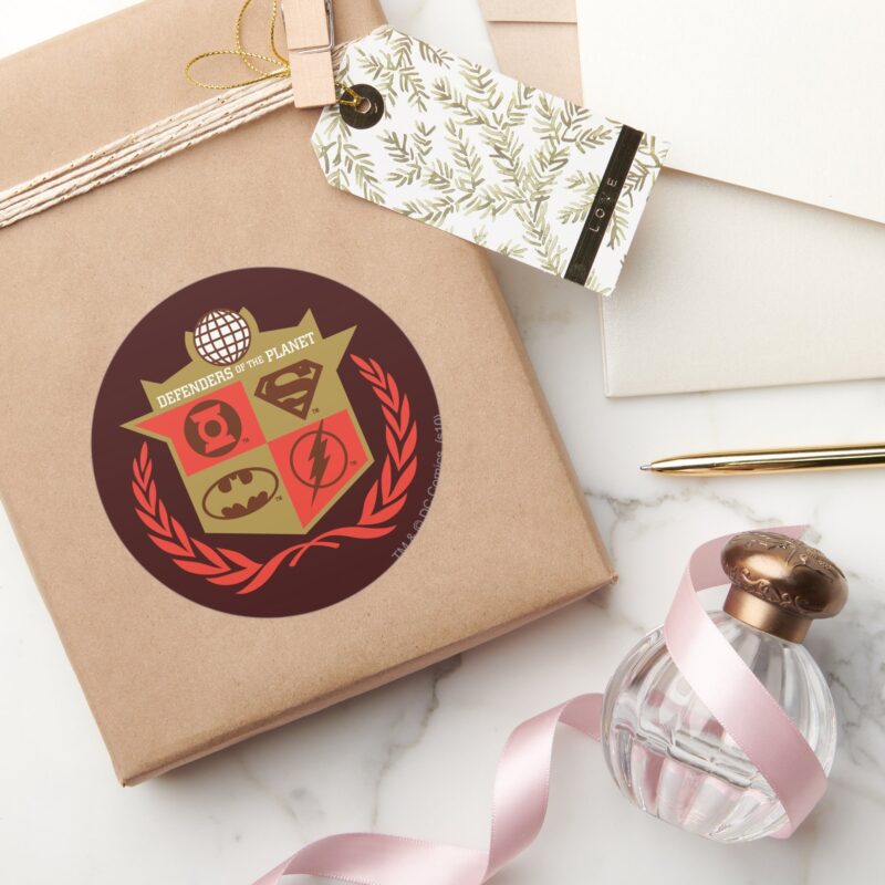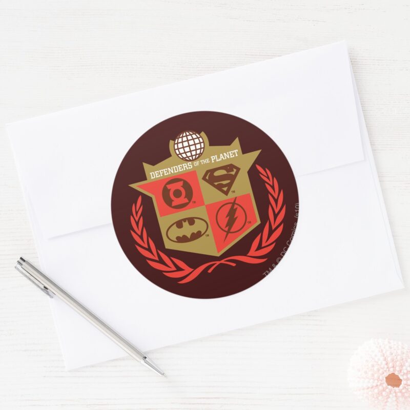 Justice League Defenders Of The Planet Classic Round Sticker vinyl sticker, waterproof durable collectible sticker for laptop, phone, bottle, bike, notebook, helmet, and accessories.