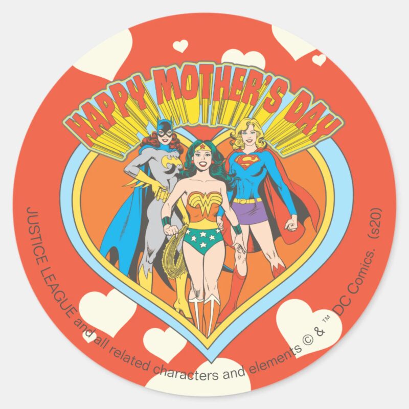 Justice League Happy Mothers Day Classic Round Sticker vinyl sticker, waterproof durable collectible sticker for laptop, phone, bottle, bike, notebook, helmet, and accessories.