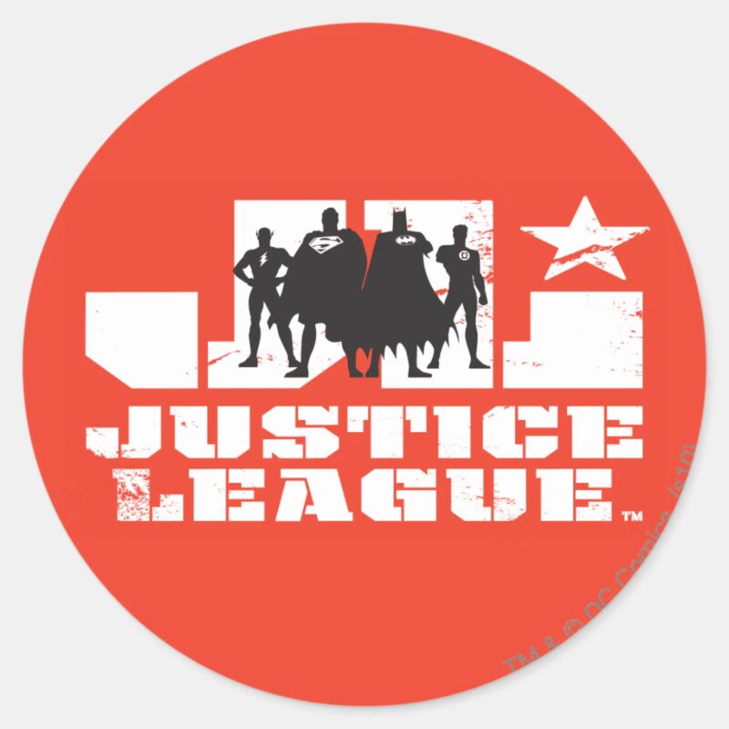 Justice League Logo And Character Silhouettes Classic Round Sticker vinyl sticker, waterproof durable collectible sticker for laptop, phone, bottle, bike, notebook, helmet, and accessories.