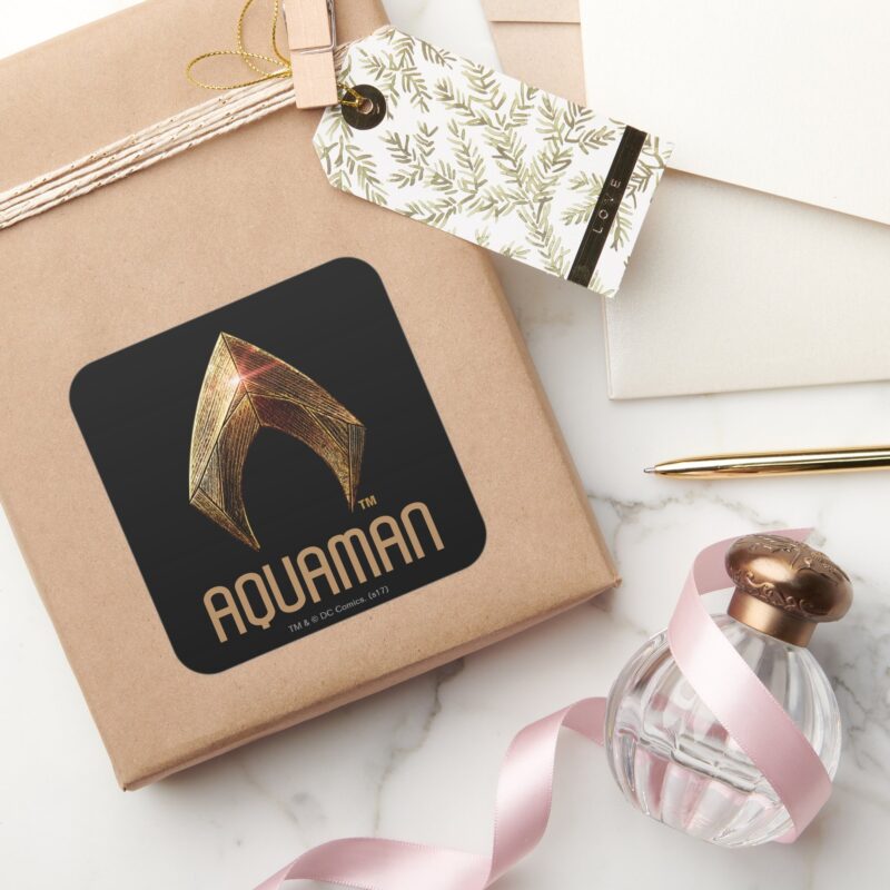 Justice League Metallic Aquaman Symbol Square Sticker vinyl sticker, waterproof durable collectible sticker for laptop, phone, bottle, bike, notebook, helmet, and accessories.