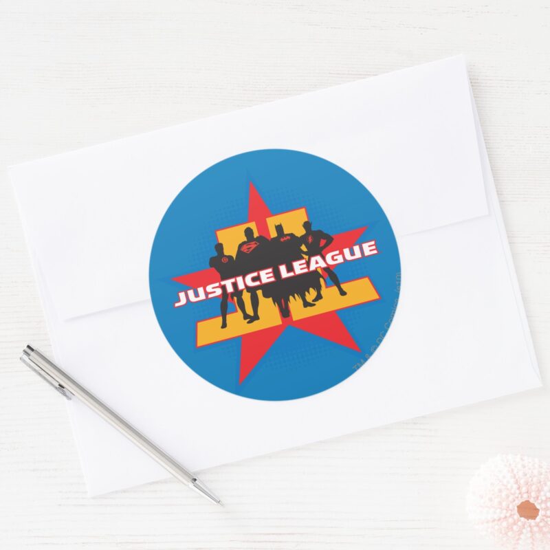 Justice League Silhouettes And Star Background Classic Round Sticker vinyl sticker, waterproof durable collectible sticker for laptop, phone, bottle, bike, notebook, helmet, and accessories.