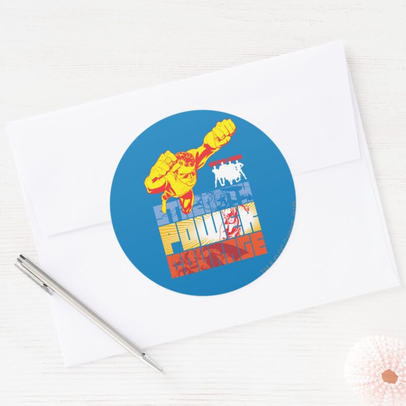 Justice League Strength. Power. Courage. Character Classic Round Sticker vinyl sticker, waterproof durable collectible sticker for laptop, phone, bottle, bike, notebook, helmet, and accessories.