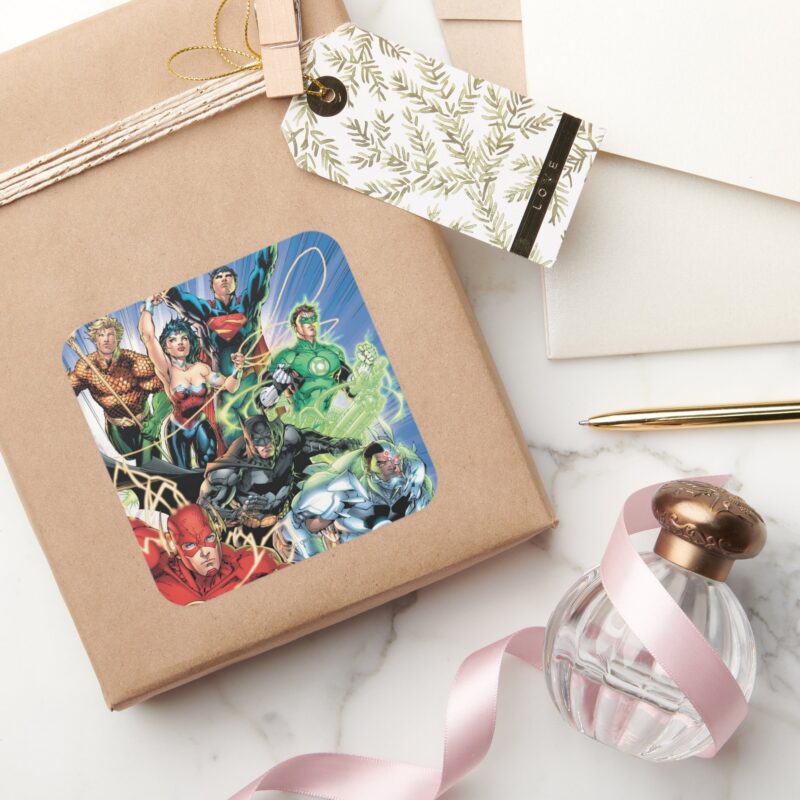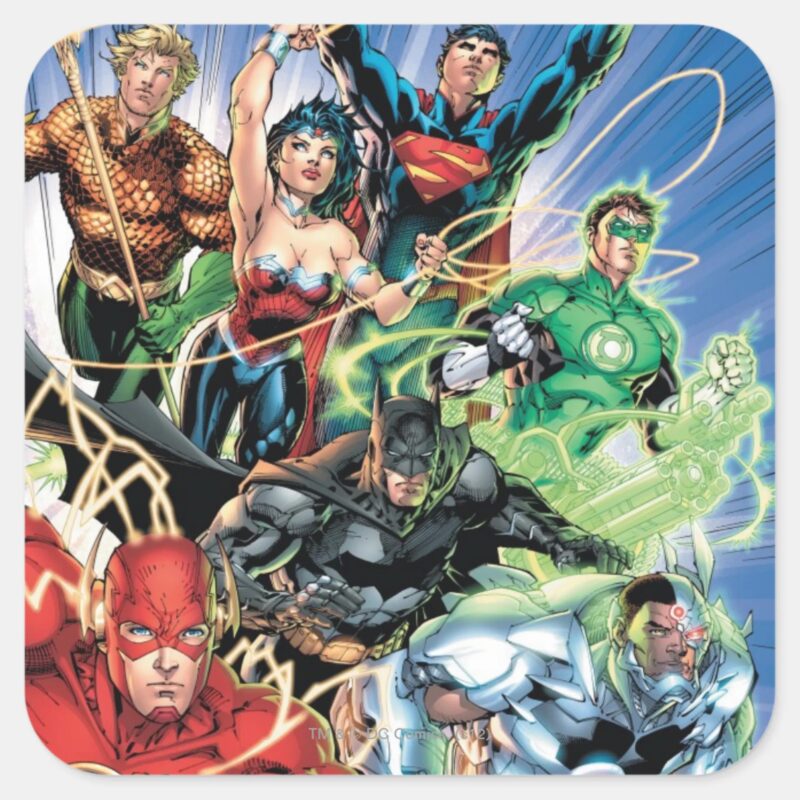 The New 52 Justice League 1 Square Sticker vinyl sticker, waterproof durable collectible sticker for laptop, phone, bottle, bike, notebook, helmet, and accessories.