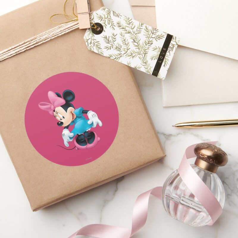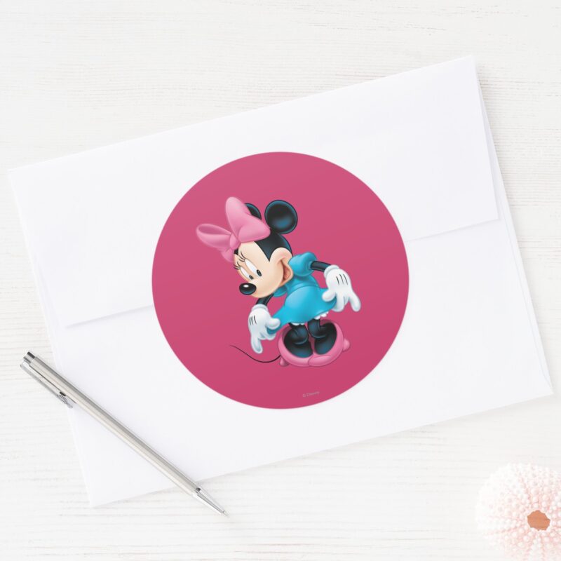 Blue Minnie Curtseying Classic Round Sticker vinyl sticker, waterproof durable collectible sticker for laptop, phone, bottle, bike, notebook, helmet, and accessories.