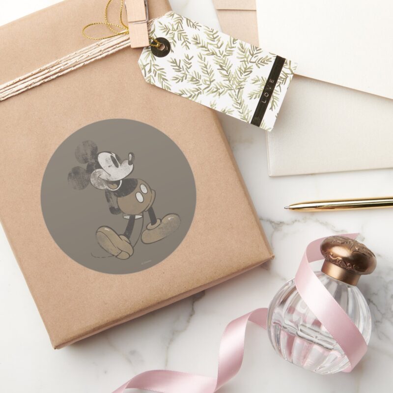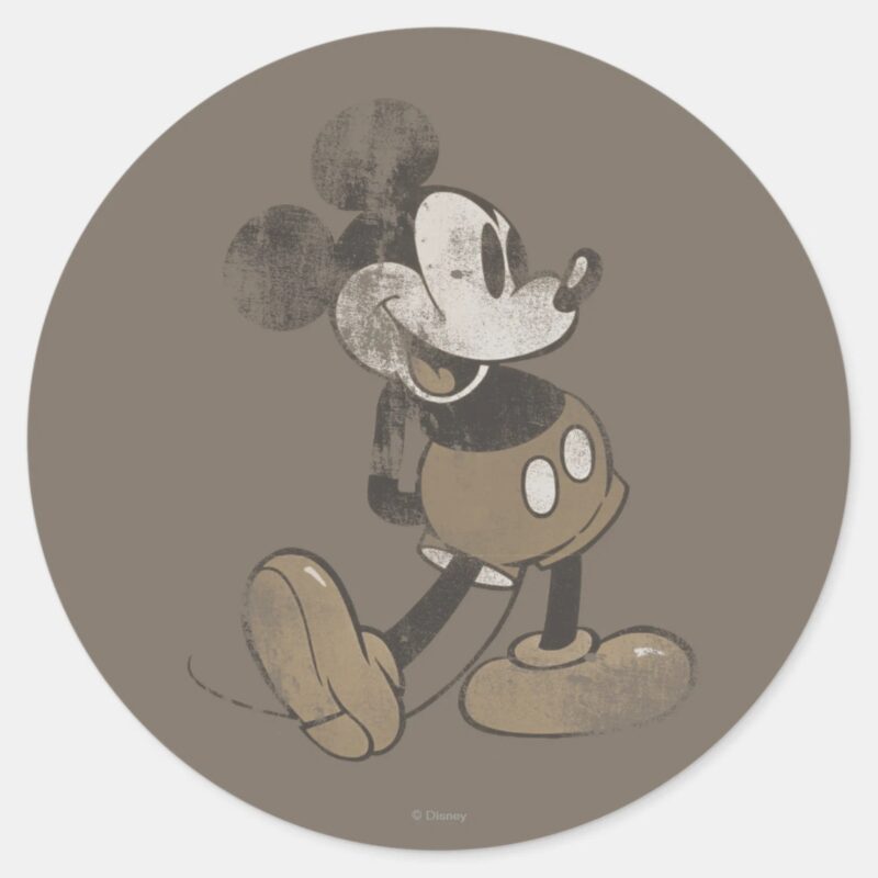 Classic Mickey Distressed Classic Round Sticker vinyl sticker, waterproof durable collectible sticker for laptop, phone, bottle, bike, notebook, helmet, and accessories.
