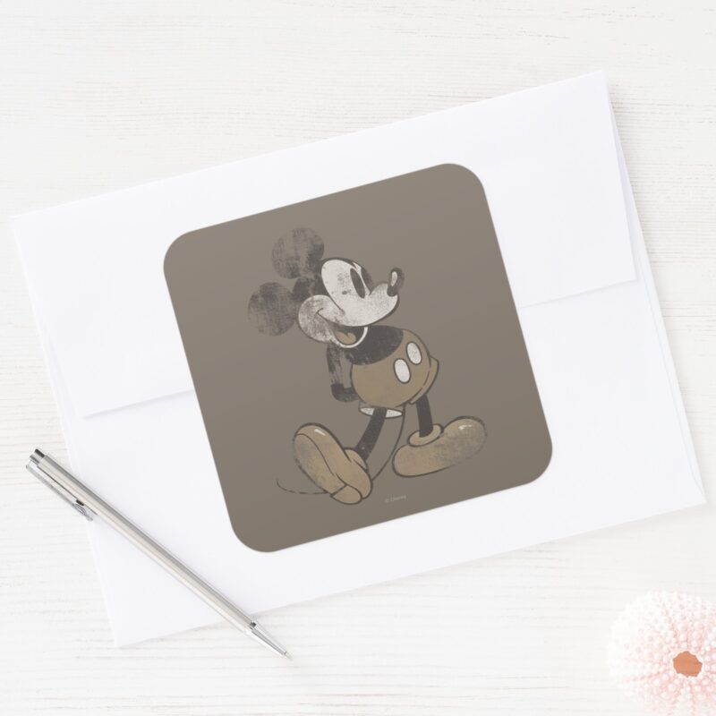 Classic Mickey Distressed Square Sticker vinyl sticker, waterproof durable collectible sticker for laptop, phone, bottle, bike, notebook, helmet, and accessories.