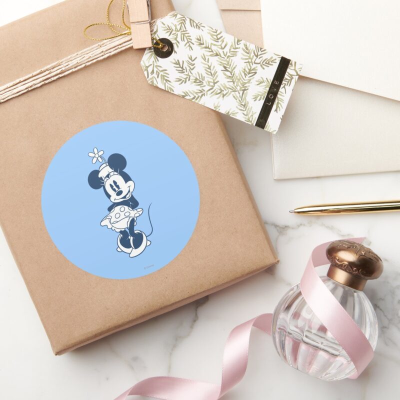 Classic Minnie Blue Hue With Flower Classic Round Sticker vinyl sticker, waterproof durable collectible sticker for laptop, phone, bottle, bike, notebook, helmet, and accessories.