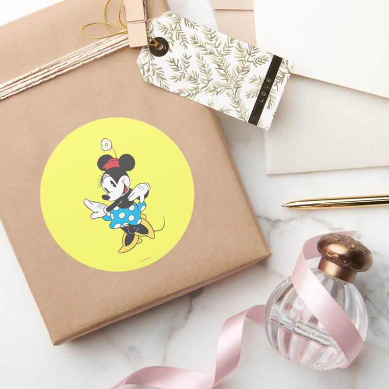 Classic Minnie Sweet Classic Round Sticker vinyl sticker, waterproof durable collectible sticker for laptop, phone, bottle, bike, notebook, helmet, and accessories.