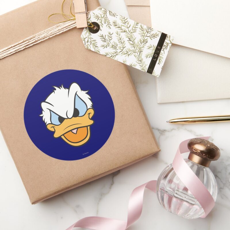 Donald Duck Angry Face Closeup Classic Round Sticker vinyl sticker, waterproof durable collectible sticker for laptop, phone, bottle, bike, notebook, helmet, and accessories.
