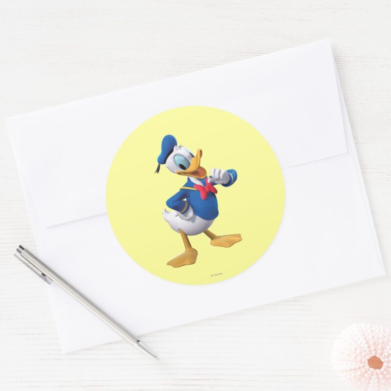Donald Duck Arm Up Classic Round Sticker vinyl sticker, waterproof durable collectible sticker for laptop, phone, bottle, bike, notebook, helmet, and accessories.