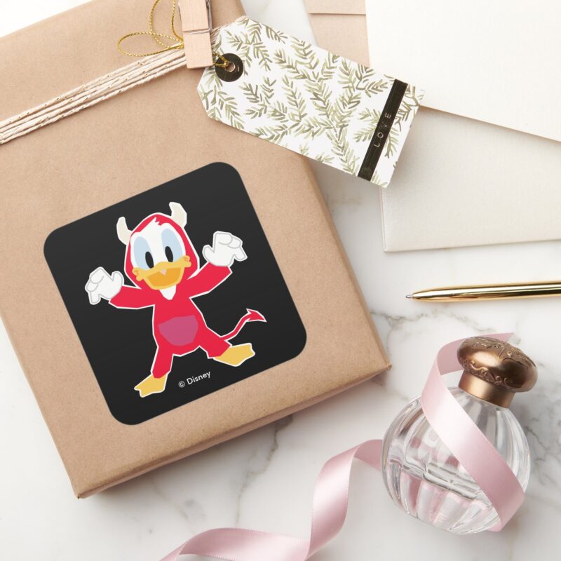Donald Duck As Devil Square Sticker vinyl sticker, waterproof durable collectible sticker for laptop, phone, bottle, bike, notebook, helmet, and accessories.