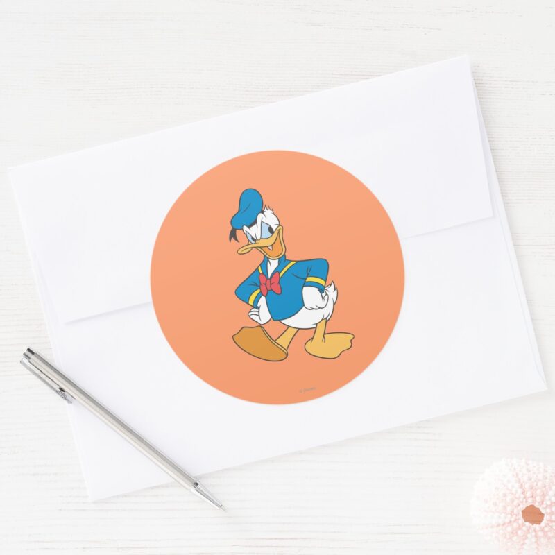 Donald Duck Talking Pose Classic Round Sticker vinyl sticker, waterproof durable collectible sticker for laptop, phone, bottle, bike, notebook, helmet, and accessories.