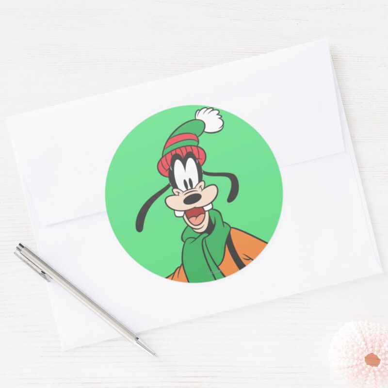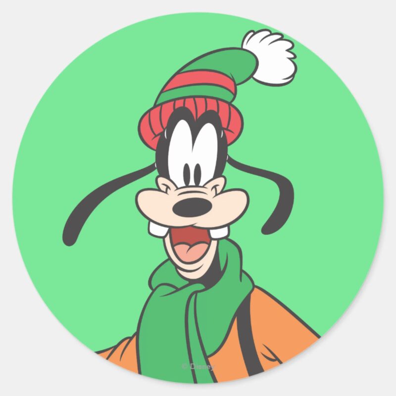 Goofy Classic Round Sticker vinyl sticker, waterproof durable collectible sticker for laptop, phone, bottle, bike, notebook, helmet, and accessories.