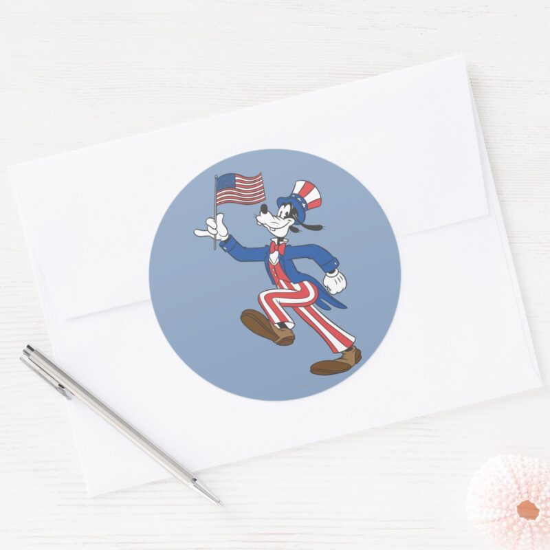 Goofy Patriotic Classic Round Sticker vinyl sticker, waterproof durable collectible sticker for laptop, phone, bottle, bike, notebook, helmet, and accessories.