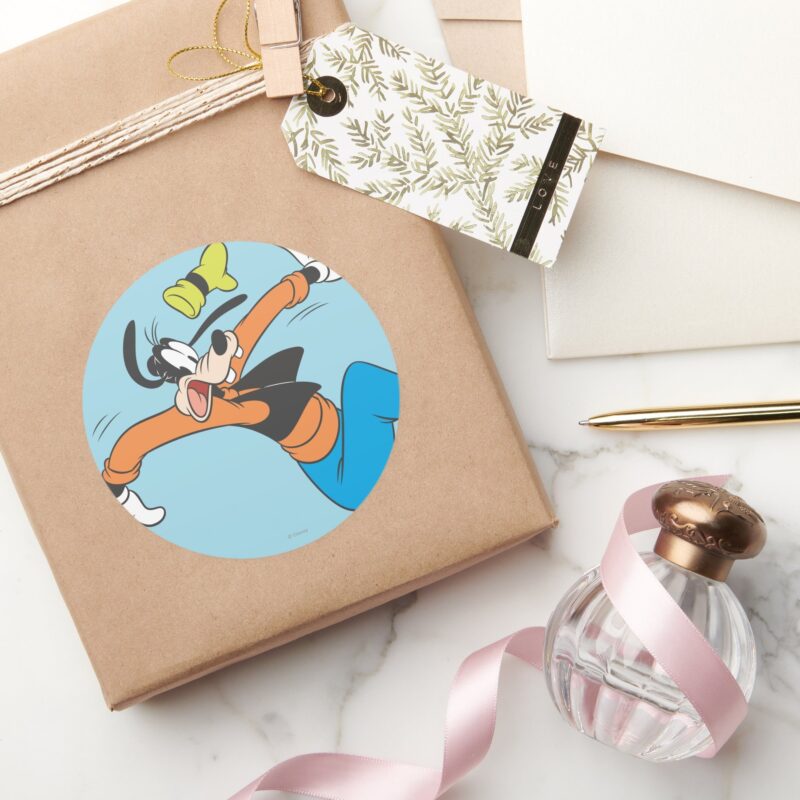 Goofy Slipping Classic Round Sticker vinyl sticker, waterproof durable collectible sticker for laptop, phone, bottle, bike, notebook, helmet, and accessories.