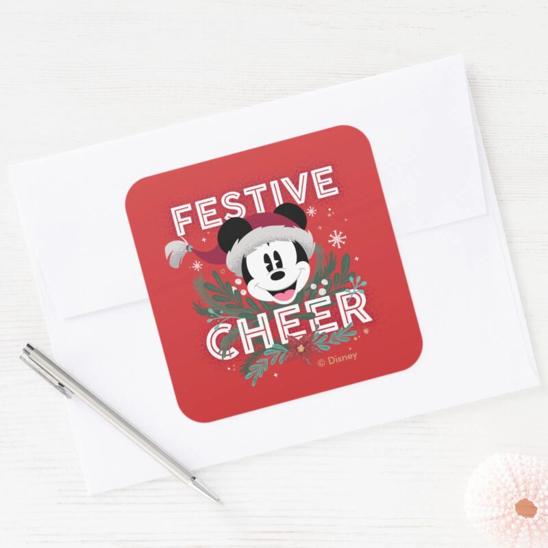 Mickey Festive Cheer Square Sticker vinyl sticker, waterproof durable collectible sticker for laptop, phone, bottle, bike, notebook, helmet, and accessories.