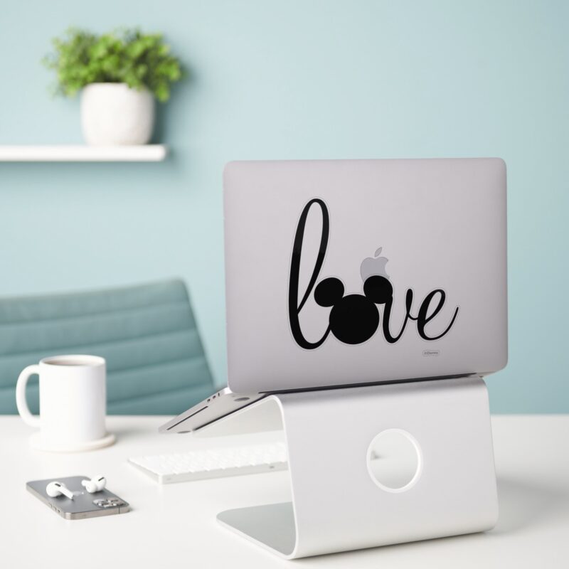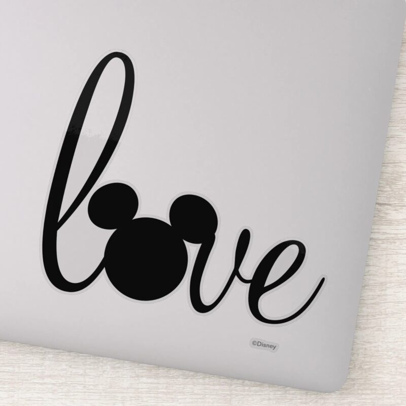 Mickey Love Script Sticker vinyl sticker, waterproof durable collectible sticker for laptop, phone, bottle, bike, notebook, helmet, and accessories.