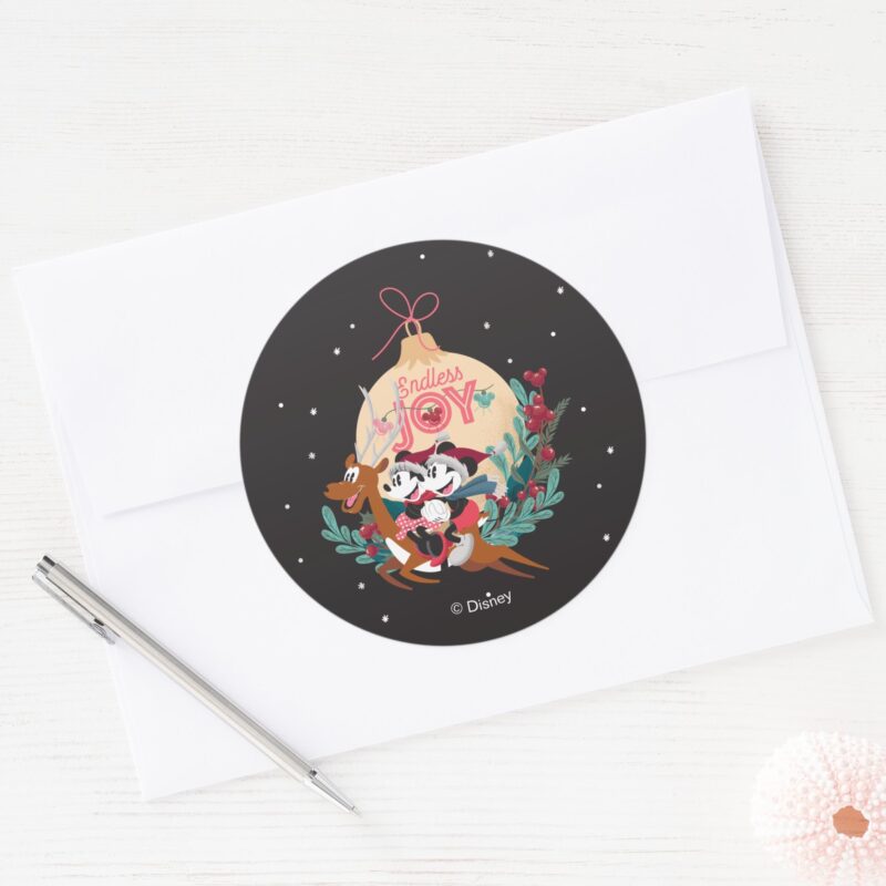 Mickey Minnie Endless Joy Classic Round Sticker vinyl sticker, waterproof durable collectible sticker for laptop, phone, bottle, bike, notebook, helmet, and accessories.