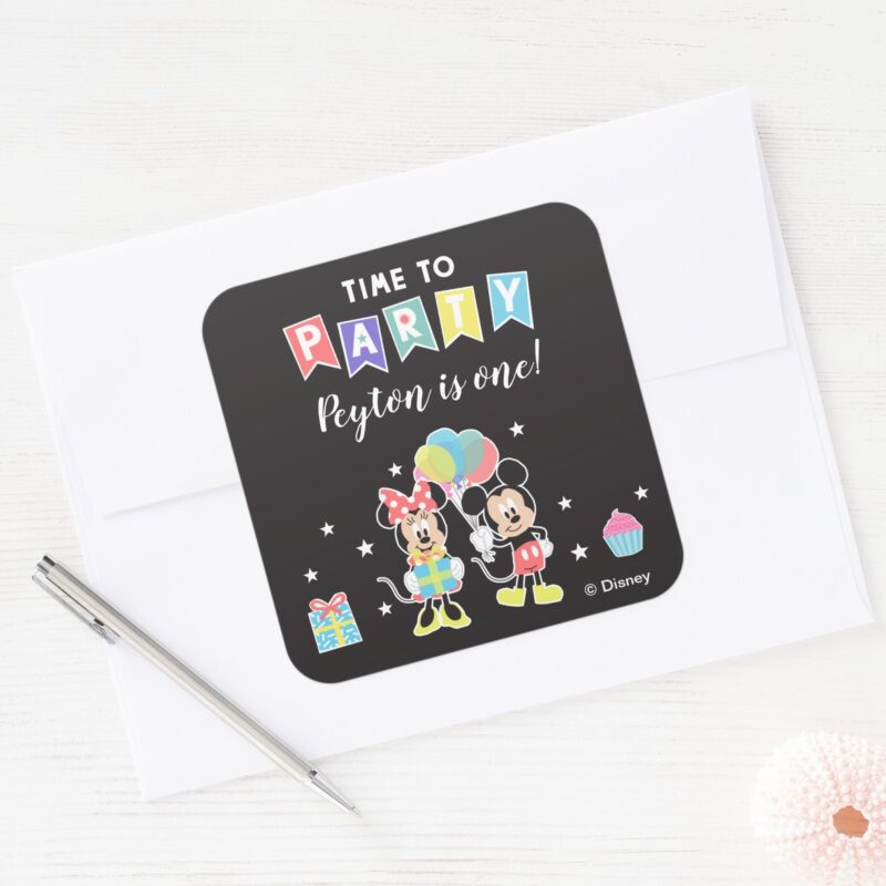 Mickey Minnie Time To Party Square Sticker vinyl sticker, waterproof durable collectible sticker for laptop, phone, bottle, bike, notebook, helmet, and accessories.