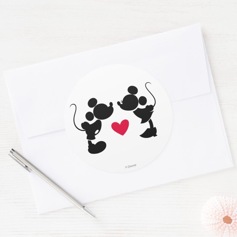 Mickey Minnie Wedding Silhouette Classic Round Sticker vinyl sticker, waterproof durable collectible sticker for laptop, phone, bottle, bike, notebook, helmet, and accessories.