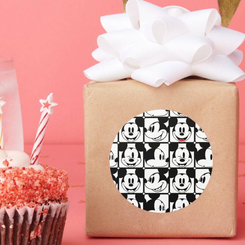 Mickey Mouse Grid Pattern Classic Round Sticker vinyl sticker, waterproof durable collectible sticker for laptop, phone, bottle, bike, notebook, helmet, and accessories.