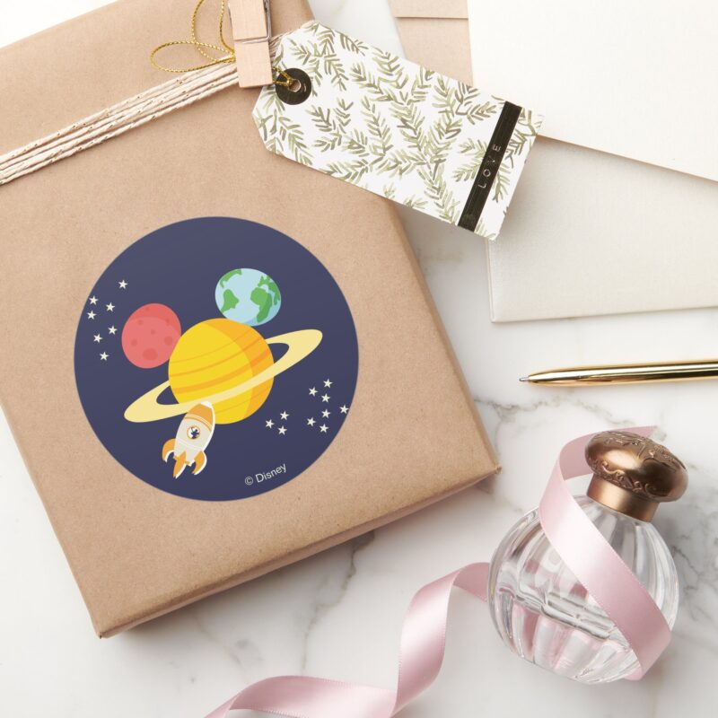 Mickey Mouse Planet Icon Classic Round Sticker vinyl sticker, waterproof durable collectible sticker for laptop, phone, bottle, bike, notebook, helmet, and accessories.