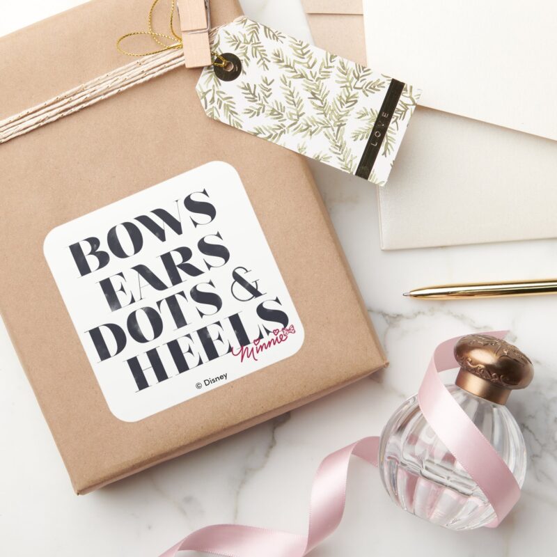 Minnie Mouse Bows Ears Dots Heels Square Sticker vinyl sticker, waterproof durable collectible sticker for laptop, phone, bottle, bike, notebook, helmet, and accessories.