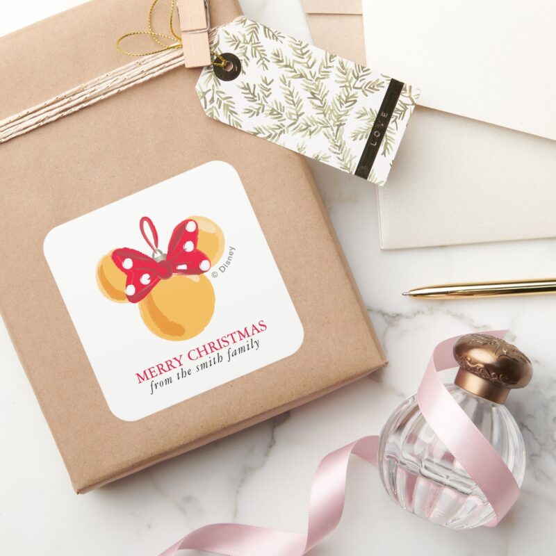 Minnie Mouse Christmas Ornament Personalized Squ Square Sticker vinyl sticker, waterproof durable collectible sticker for laptop, phone, bottle, bike, notebook, helmet, and accessories.