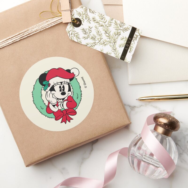 Minnie Mouse Cute Holiday Wreath Classic Round Sticker vinyl sticker, waterproof durable collectible sticker for laptop, phone, bottle, bike, notebook, helmet, and accessories.