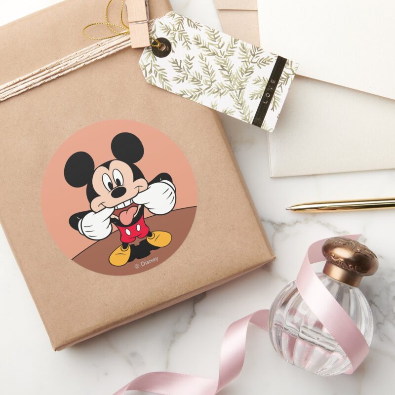 Modern Mickey Sticking Out Tongue Classic Round Sticker vinyl sticker, waterproof durable collectible sticker for laptop, phone, bottle, bike, notebook, helmet, and accessories.