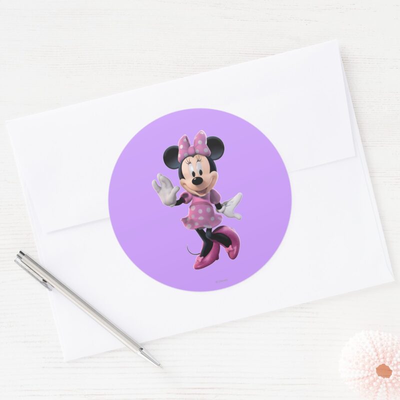 Pink Minnie Cute Pose Classic Round Sticker vinyl sticker, waterproof durable collectible sticker for laptop, phone, bottle, bike, notebook, helmet, and accessories.