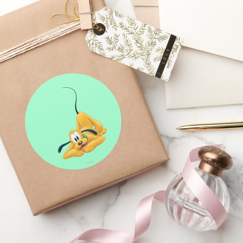 Pluto Laying Down Classic Round Sticker vinyl sticker, waterproof durable collectible sticker for laptop, phone, bottle, bike, notebook, helmet, and accessories.