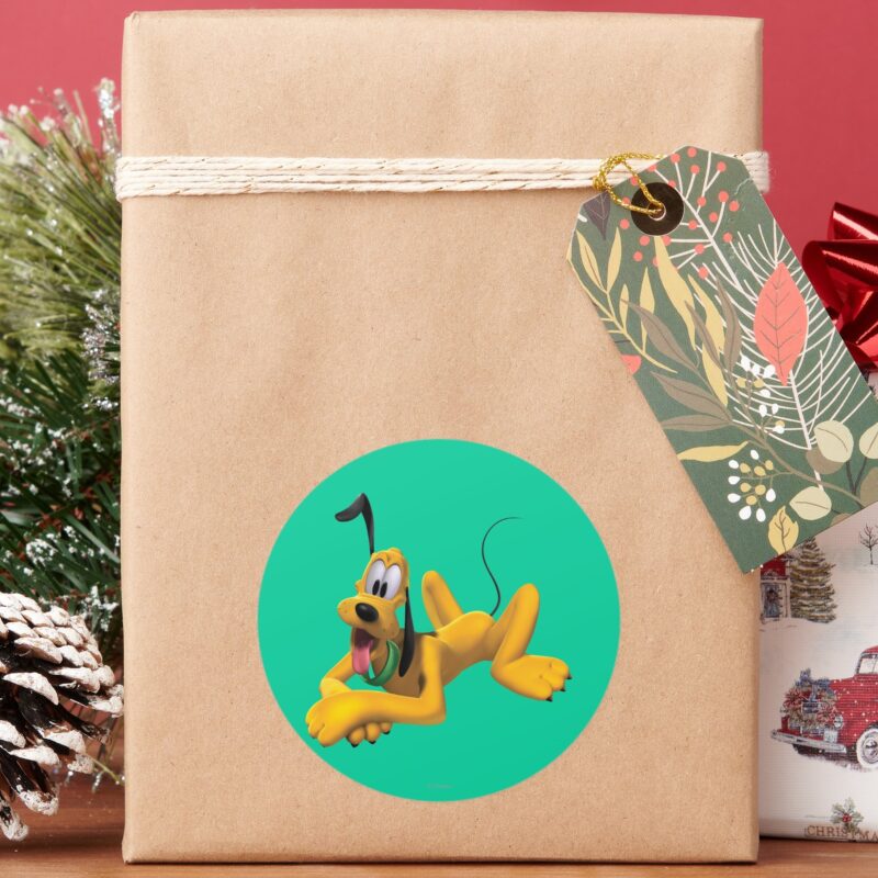 Pluto Laying With Ear Up Classic Round Sticker vinyl sticker, waterproof durable collectible sticker for laptop, phone, bottle, bike, notebook, helmet, and accessories.