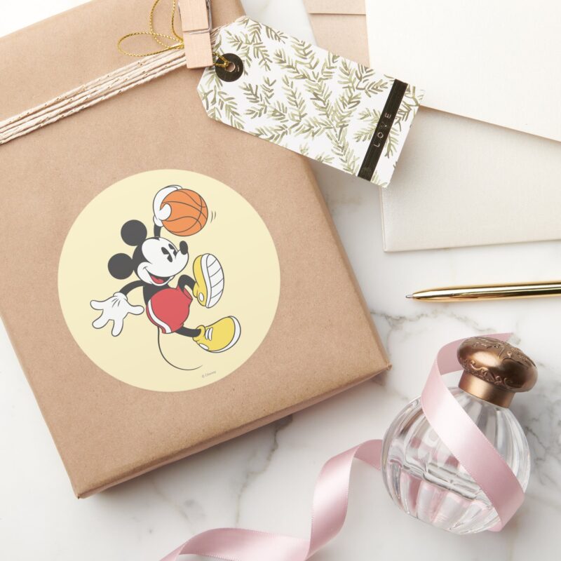 Sporty Mickey Basketball Player Classic Round Sticker vinyl sticker, waterproof durable collectible sticker for laptop, phone, bottle, bike, notebook, helmet, and accessories.