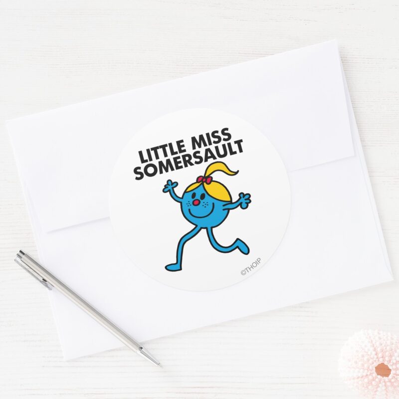 Little Miss Somersault Walking Tall Classic Round Sticker vinyl sticker, waterproof durable collectible sticker for laptop, phone, bottle, bike, notebook, helmet, and accessories.
