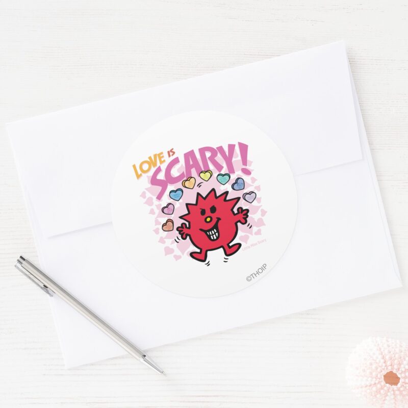 Love Is Little Miss Scary Classic Round Sticker vinyl sticker, waterproof durable collectible sticker for laptop, phone, bottle, bike, notebook, helmet, and accessories.