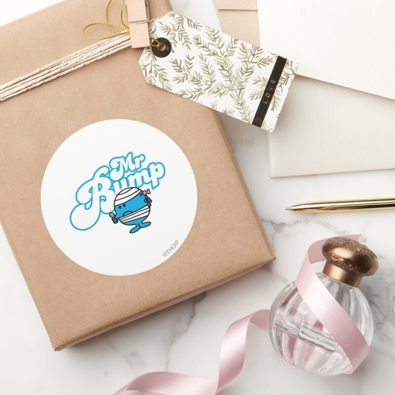 Mr. Bump Bandaged Thumb Classic Round Sticker vinyl sticker, waterproof durable collectible sticker for laptop, phone, bottle, bike, notebook, helmet, and accessories.