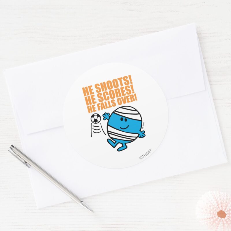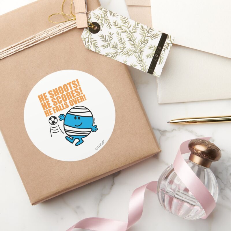 Mr. Bump Playing Soccer Classic Round Sticker vinyl sticker, waterproof durable collectible sticker for laptop, phone, bottle, bike, notebook, helmet, and accessories.